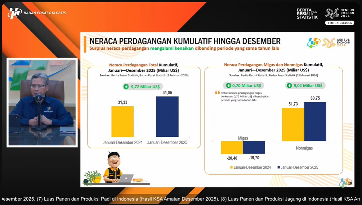 ”Surplus sepanjang periode Januari-Desember 2025 ditopang oleh surplus komoditas nonmigas sebesar US$60,75 miliar, sementara komoditas migas masih mengalami defisit US$19,70 miliar,” kata Deputi Bidang Statistik Distribusi dan Jasa BPS Ateng Hartono pada konferensi pers Senin (2/2/2026).