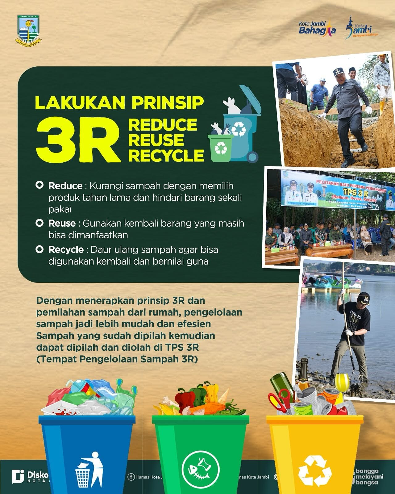 Reduce berarti mengurangi penggunaan barang sekali pakai. Reuse mengajak warga memanfaatkan kembali barang yang masih bisa digunakan. Sementara Recycle mendorong pemilahan sampah agar dapat didaur ulang, yang salah satunya difasilitasi oleh Tempat Pengelolaan Sampah 3R (TPS 3R).