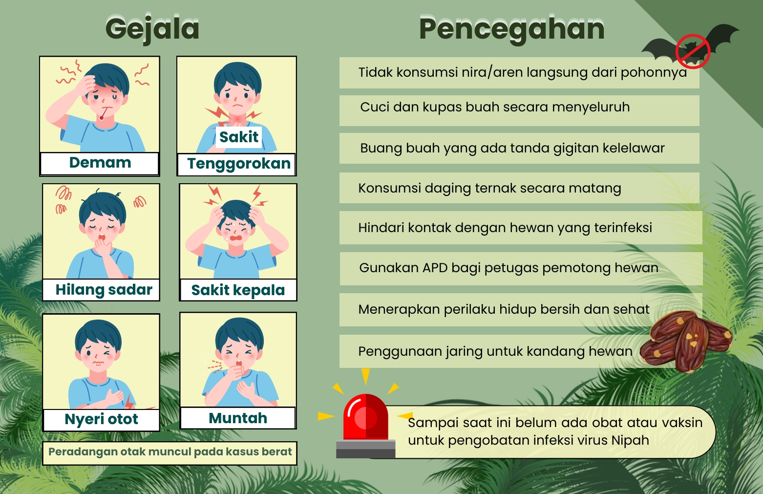 Selain itu, masyarakat dianjurkan mencuci dan mengupas buah sebelum dimakan, serta membuang buah yang menunjukkan bekas gigitan kelelawar. Daging ternak juga harus dimasak hingga matang sempurna untuk mencegah risiko penularan.